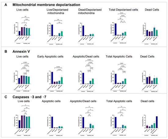 Detection of biochemical apoptosis with flow cytometric assays. Bar graphs of HeLa cell populations with (A) depolarized mitochondrial membrane potential, (B) externalized phosphatidylserine residues, (C) activated terminal caspases −3 and −7. Data represent mean values from three biological replicates. Dot plots are presented in Supplementary Figure S1. (* p < 0.05; ** p < 0.01; *** p < 0.001; **** p < 0.0001).