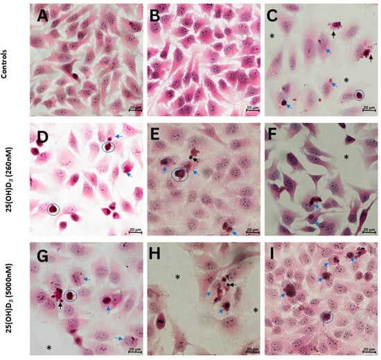 Brightfield microscopy images of HeLa cells stained with hematoxylin and eosin. Gross morphology of medium (A) and solvent (B) control showed clusters of healthy adenocarcinoma cells. The actinomycin D-treated positive control (C) showed decreased cell density (asterisks), cell blebbing and apoptotic bodies (black arrows), shrunken cytoplasm (blue circles), and nuclear and cytoplasm damage (blue arrows). Cultures treated with 25(OH)D3 at 260 nM (D–F) and 5000 nM (G–I) showed cells with hyper-condensed chromatin and nuclear damage (blue arrows), and apoptotic bodies and blebbing (black arrows). In addition, some experimental cultures showed round and shrunken cells (blue circles) and decreased cell density (asterisks). Scale bar = 20 µm.