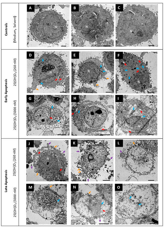 Ultrastructural features were observed with transmission electron microscopy. Nuclear membrane damage, apoptotic bodies, membrane blebbing, and dilated endoplasmic reticula and Golgi apparatus were visible with 25(OH)D3 treatment (Figure 4). In addition, mitochondria exhibited cristae disarrangement, partial and total cristolysis, and an electron lucent matrix with 25(OH)D3 treatments (Figure 5).
