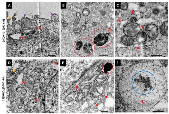 Ultrastructural analysis of 25(OH)D3-treated HeLa cells by transmission electron microscopy. HeLa cells treated with (A–C) 260 nM and (D,E) 5000 nM 25(OH)D3 showed features of apoptotic cell death. Mitochondria exhibited cristae disarrangements, partial or total breakdown of cristae (cristolysis), electron dense matrix (C), or electron lucent matrix (A,D,E). Darkly stained mitochondria ((B,E), red dashed circles) showed signs of mitophagy. Cell membrane (A,D) exhibited blebbing (purple arrow) and apoptotic bodies (orange arrow) were visible intercellular space. Dilated ER was shown in both treatments ((A–E), red arrow). Karyorrhexis (blue dashed circle) was observed in some cells (F). C, Cytoplasm. N, nucleus. Scale bar = 1.0 µm (A). Scale bar = 500 nm (B,C,E). Scale bar = 2.0 µm (D). Scale bar = 5.0 µm (F).