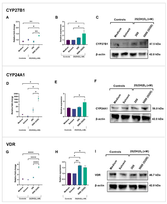 Gene and protein expression of VDMS in HeLa control and experimental cultures. CYP27B1 gene (A) and protein (B,C), CYP24A1 gene (D) and protein (E,F), and VDR gene (G) and protein expression (H,I) were assessed by RT-qPCR and Western blotting. Data represent mean values from three biological repeats. Full-length blots/gels are presented in Supplementary Figure S2. (* p < 0.05; ** p < 0.01; **** p < 0.0001).