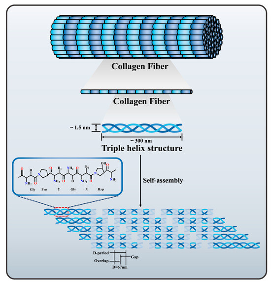 The primary structure of collagen predominantly consists of the repeating amino acid sequence [Gly-X-Y]n, where proline and hydroxyproline occupy the X and Y positions, respectively; the secondary structure results from the spatial exclusion between proline and hydroxyproline residues at the X and Y positions, forming an α-helix [23]. The tertiary structure, known as tropocollagen, is approximately 300 nm in length, 1.5 nm in diameter, and has a molecular weight of approximately 300 kDa. It is synthesized into a superhelix from three left-handed helical polypeptide chains [24]. Additionally, the tertiary structure forms a collagen microfiber synthesized from tropocollagen, with a staggered quarter-cycle arrangement of the head and tail. These fibers are cross-linked in parallel by covalent bonds and exhibit a band gap in a D-type cycle (approximately 67 nm) [25] (Figure 1).
