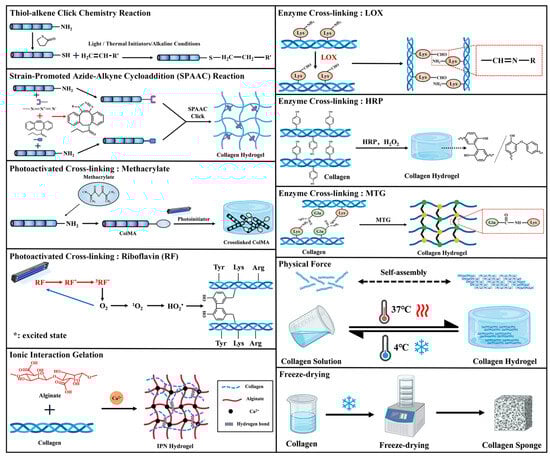Enzyme cross-linking offers several advantages, including mild reaction conditions, minimal by-product formation, high specificity, and high yield. The key enzymes utilized in this process include lysine oxidase (LOX), glutamine transaminase (MTG), and horseradish peroxidase (HRP), which primarily target amino groups. Under physiological conditions, the post-translational modification of these enzymes on collagen helps maintain its stability, elasticity, and bioactivity. The strength of the gel can be regulated by adjusting the enzyme concentration, facilitating the formation of robust covalent bonds and promoting rapid gelation [72,73].