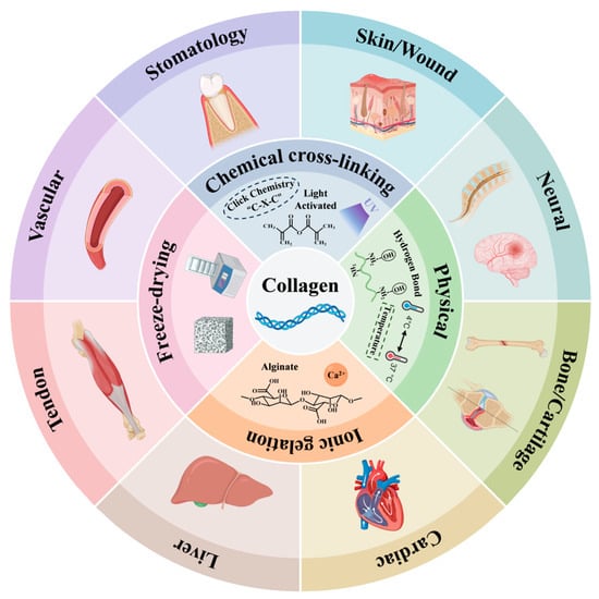 This review provides a brief introduction to collagen, focusing on its structure, biological properties, and effects on the regulation of cellular behavior, as well as outlining the methods of collagen scaffold preparation, detailing its specific applications in tissues such as skin, nerves, bone, heart, and liver, and concluding with an outlook on future research directions in the field of collagen.