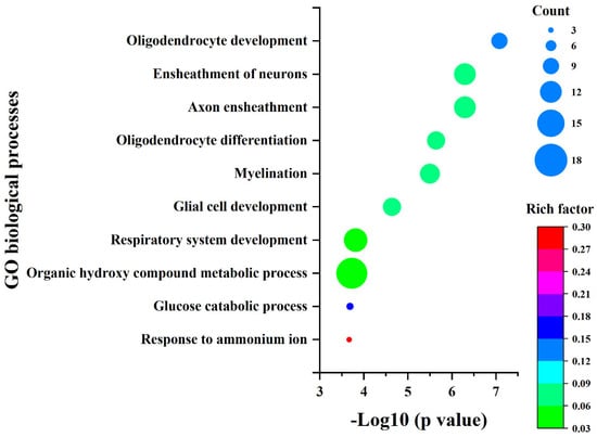 The expression of Cd9 in neurons was significantly reduced after 48 h of exposure to 100 μM Ni2+ compared to the control group. The expression level decreased with increasing Ni2+ concentration, reaching its lowest point at 200 μM Ni2+, and showed no significant change with further increases in Ni2+ concentration (Figure 9c). The reduction in Cd9 expression led to axonal myelin loss, resulting in abnormal electrophysiological function. This manifested as a decrease in the amplitude of action potentials generated by the AIS and a reduction in the axonal signal transmission speed []. While some studies have explored the effects of the HIF-1α pathway on Cd9 expression under hypoxic conditions, the results are inconsistent, indicating that the HIF-1α pathway is not the sole determinant of Cd9 expression [,,,]. Therefore, the specific cause of the significant reduction in Cd9 expression in neurons following Ni2+ treatment remains to be elucidated.