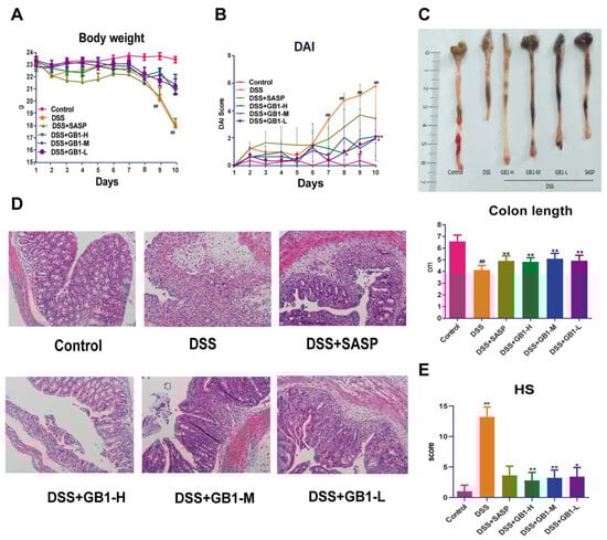 The effect of GB1 on DSS-induced colitis in mice. (A) The weight change of mice after the onset of DSS-induced colitis; (B) The score of disease activity index; (C) colon length; (D) Pathological changes of colon tissue (HE staining, 200×); (E) Histological score of HE stained colon sections. ## p < 0.01, versus with control group, * p < 0.05, ** p < 0.01, versus with DSS group.