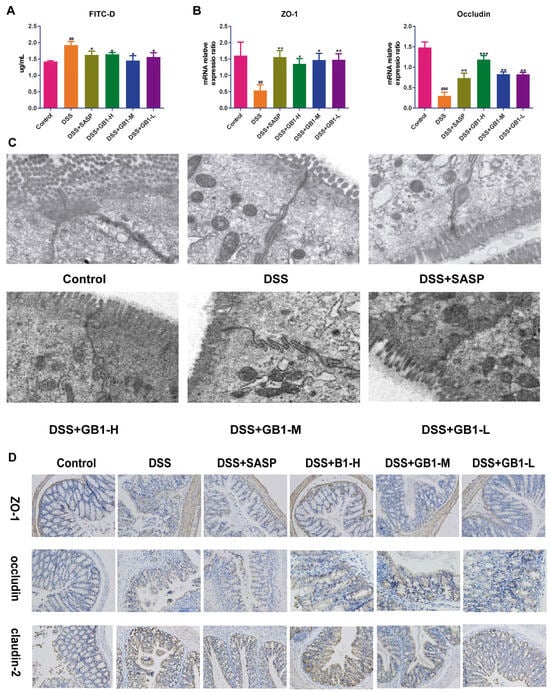 DSS administration significantly increased both the concentration and intestinal permeability of fluorescein isothiocyanate dextran (FITC-D) in our experimental model. Notably, GB1 or SASP pretreatment effectively attenuated these DSS-induced effects, demonstrating reduced FITC-D levels and improved barrier function (Figure 2A). At the molecular level, quantitative PCR analysis revealed that GB1 and SASP treatment upregulated mRNA expression of tight junction components ZO-1 and occludin in colonic tissues (Figure 2B). Ultrastructural examination by electron microscopy showed that both treatments enhanced tight junction density, reduced intercellular space, restored microvilli organization, and preserved desmosome integrity compared to DSS-treated controls (Figure 2C). Immunohistochemical analysis confirmed these findings at the protein level, with ZO-1, occludin, and claudin-2 expression patterns mirroring their respective mRNA profiles (Figure 2D).