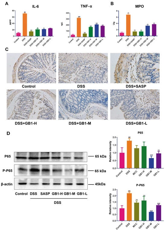 The effect of GB1 on DSS-induced colon inflammation in mice. (A) ELISA to determine the content of IL-6 and TNF-α in colon tissue; (B) Kit to detect myeloperoxidase (MPO) activity in colon tissue; (C) Immunohistochemical detection of CD11b expression in colon tissue (200×); (D) The expression levels of NF-κB p65 and P-NF-κB p65 in mouse colon tissue were detected by western blot. Versus with Control group, ## p < 0.01, ### p < 0.001; versus with DSS group, * p <0.05, ** p < 0.01, *** p < 0.001.