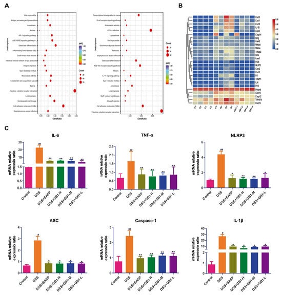 mRNA-seq experiment. (A) KEGG enrichment analysis (x axis represents the differential gene set, y axis represents the KEGG enrichment pathway, and the dot size represents the number of genes annotated on the KEGG pathway); (B) Differential gene expression levels (C represents normal group, D represents model group, GB1 represents drug group, blue represents low expression, and red represents high expression); (C) The mRNA expression levels of IL-6, TNF-α, NLRP3, ASC, Caspase-1 and IL-1β in colon tissue were detect-ed by qRT-PCR. # p < 0.05, ## p < 0.01, versus with control group; versus with DSS group, * p < 0.05, ** p < 0.01.