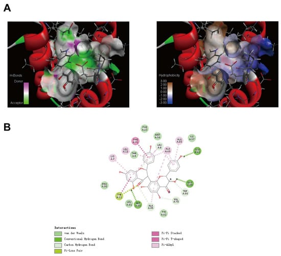 3D schematic diagram of GB1 combined with NLRP3-PYD (Figure 5A). The docking score of NLRP3 protein and GB1 is more than 7 points. The total score of the target protein 2naq and GB1 is 10.4516 and CSCORE is 4 points. Discovery Studio software (https://www.3ds.com/products/biovia/discovery-studio, accessed on 19 March 2025) performs MOLCAD analysis on the docked small molecules and proteins to obtain the surface hydrophobic region of the target protein 2naq and the hydrogen bond donor and acceptor regions, as well as the binding mode map of the target protein and GB1 (Figure 5B). A Van der Waals interaction force was formed between GB1 and protein residues like ILE 57, MET 56, PHE 23, THR 4, PRO 90, LEU 81, TYR 82, and forms hydrogen bonds with protein residues GLU 62, GLU 89. A π lone pair electron interaction was formed between GB1 and protein residue TYR 11, and a π-π T-type interaction was formed between GB1 and protein residue PHE 73. In addition, GB1 forms a hydrophobic interaction with protein residues ALA 65, ALA 69, LEU 12, and LYS 7.