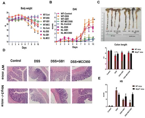 The effect of GB1 on DSS-induced colitis in WT and Nlrp3-/- mice. (A) The weight change of WT and Nlrp3-/- mice after onset of DSS-induced colitis; (B) The score of disease activity index of WT and Nlrp3-/- mice; (C) Colon length of WT and Nlrp3-/- mice; (D) Pathological changes of colon tissue of WT and Nlrp3-/- mice (HE staining, 200×); (E) Histological score of HE stained colon sections of WT and Nlrp3-/- mice. # p < 0.05, ## p < 0.01, versus with control group; * p < 0.05, ** p < 0.01, versus with DSS group.
