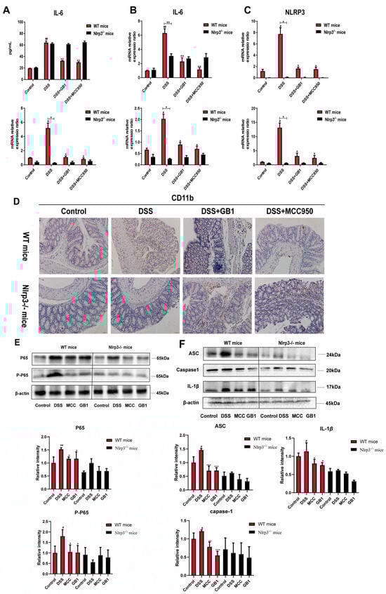 Serum cytokine analysis revealed that DSS challenge significantly elevated IL-6 levels in both genotypes, with Nlrp3-/- mice exhibiting lower concentrations than WT controls (Figure 7A). GB1 treatment effectively reduced IL-6 secretion in WT mice, while no significant changes were observed in Nlrp3-/- mice. This finding was corroborated by parallel reductions in IL-6 mRNA expression (Figure 7B). Immunohistochemical analysis demonstrated that DSS-induced upregulation of CD11b in colonic tissues was attenuated by GB1 or MCC950 pretreatment in WT but not Nlrp3-/- mice (Figure 7D). Similarly, DSS-mediated NF-κB phosphorylation was significantly blunted in Nlrp3-/- mice compared to WT controls. GB1 treatment suppressed NF-κB activation in WT mice without affecting obviously Nlrp3-/- mice (Figure 7E).