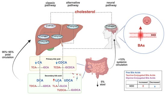 The canonical BA synthesis pathway occurs predominantly in the liver, where cholesterol is hydroxylated by cytochrome P450 7A1 (CYP7A1) to form 7α-hydroxycholesterol, subsequently processed into primary BAs (CA and CDCA). An alternative pathway mediated by CYP27A1 generates CDCA. Notably, cerebral BA synthesis involves CYP46A1-mediated conversion of cholesterol to CDCA, which is further modified into secondary BAs (DCA, LCA, UDCA) by gut microbiota. Circulating BAs can also traverse the blood–brain barrier (BBB) to access the central nervous system (refer to Figure 1) [4,5]. Importantly, interspecies differences exist: humans primarily synthesize CA and CDCA, whereas rodents produce CA and muricholic acids (MCAs) as major primary BAs [6].
