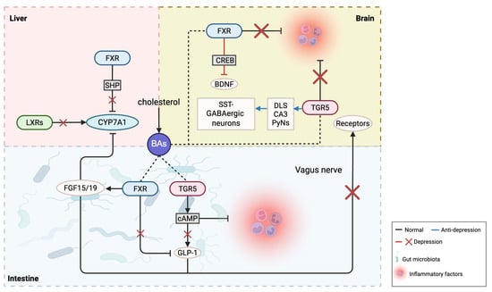 The onset of depression is associated with chronic inflammation and immune system activation. Peripheral inflammation, stemming from infections, trauma, or other diseases, can lead to the activation of immune cells such as macrophages, which release inflammatory factors. These factors can cross the blood–brain barrier, enter the brain, activate glial cells and neurons, and lead to abnormal neuronal activity and neurotransmitter release, thereby affecting brain regions’ functions and physiological processes related to emotion regulation. Studies have found that depressive patients have higher levels of pro-inflammatory biomarkers in their blood [40,41,42]. Recently, some evidence has shown that BAs and their receptors are also implicated in inflammation regulation and immune response, which contributes to anti-depressive effects.