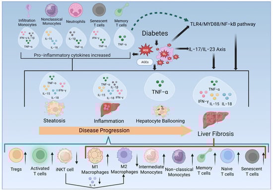 | CD4+CD44+CD62L- | Increased | 1.4 [31] | <0.01 | ↑TNF-α [31] | High-fat-diet-fed diabetic mice within specific-pathogen-free (T2DM) environment vs. exposed to open environment | Steatosis and inflammation and hepatocyte ballooning and fibrosis | ||