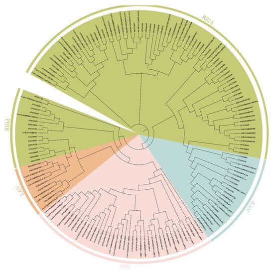 To elucidate evolutionary relationships, we constructed a phylogenetic tree containing these 52 cucumber B3 genes and 118 Arabidopsis B3 superfamily homologs (Figure 2). The analysis revealed conserved clustering patterns. Cucumber LAV, RAV, and ARF subfamilies formed well-supported clades with their Arabidopsis counterparts. However, REM family members exhibited divergent phylogenetic relationships, suggesting substantial functional diversification within this gene family.