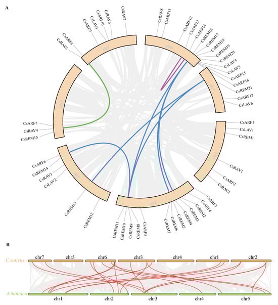 Collinearity analysis of B3 genes. (A) Collinear map of different B3 genes within cucumber. (B) Collinear map of B3 genes between cucumber and Arabidopsis. Gray lines show all gene duplications, while color lines show collinearity of B3 genes. The chromosome number and gene ID are illustrated.
