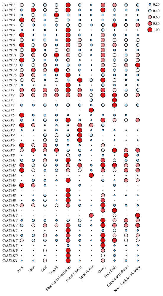 As illustrated in Figure 6, B3 members exhibited marked tissue-specific expression divergence, particularly within the ARF subfamily. Almost each ARF gene demonstrated unique spatial expression patterns, consistent with their established roles as auxin-responsive transcription factors governing morphogenesis in multiple plant tissues. In contrast to the diverse expression patterns observed among ARF members, the majority of REM family genes exhibit preferential expression in the shoot apical meristem (SAM), suggesting their potential involvement in early organogenesis. Only a subset of REM members demonstrated organ-specific enrichment: CsREM4 displayed predominant expression in male flowers, CsREM6 in roots, and CsREM18 in ovaries. This spatial expression specialization implies functional diversification within the REM family, with distinct members likely contributing to developmental processes in specific tissues.