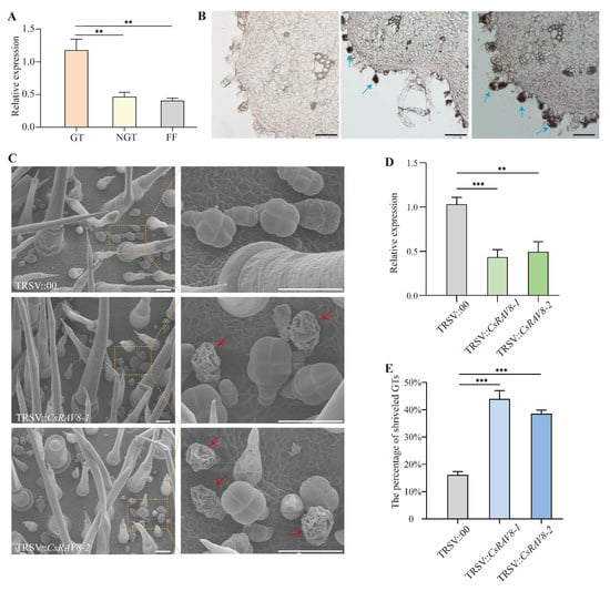 Functional characterization using virus-induced gene silencing (VIGS) demonstrated a marked phenotypic alteration, with silenced plants exhibiting 44.0% and 38.5% shriveled glandular trichomes compared to 16.1% in wild-type controls (Figure 7C–E). Considering the established association between trichome collapse and senescence dynamics [], these findings suggest CsRAV8′s potential regulatory role in preserving secretory cavity integrity. Collectively, our data identify CsRAV8 as a glandular trichome-specific regulator implicated in maintaining secretory compartment homeostasis.