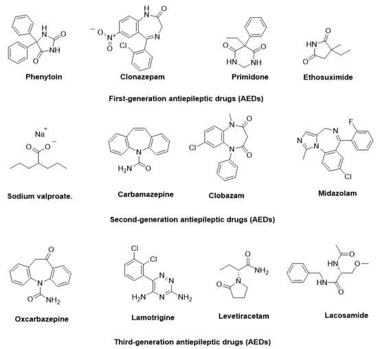 The pathophysiology of epilepsy involves complex mechanisms, such as abnormal neuronal firing, neurotransmitter imbalances, ion channel dysfunction, and genetic predispositions. Additionally, factors like inflammation, oxidative stress, and immune responses further contribute to its onset and progression [6]. To manage epilepsy, more than 30 antiepileptic drugs (AEDs) have been approved for clinical use, targeting diverse mechanisms, including voltage-gated ion channel modulation, GABAergic transmission enhancement, and glutamate receptor inhibition [7]. In Figure 1, some AEDs that have been approved for the treatment of epilepsy are illustrated. Despite these advancements, approximately 30% of patients experience drug-resistant epilepsy, where monotherapy proves insufficient. For these patients, achieving therapeutic efficacy often requires polytherapy, involving the concurrent administration of two to four AEDs with complementary mechanisms of action, tailored to their specific condition.