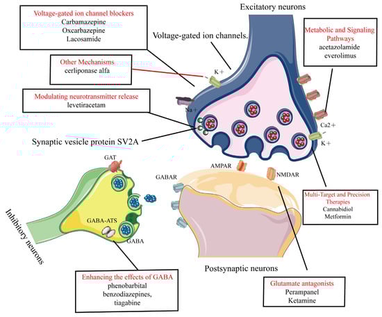 - Other mechanisms: these include inhibition of the Na+-K+-2Cl− cotransporter 1 (NKCC1) transporter, modulation of neuronal growth and plasticity, and lysosomal enzyme replacement therapy (e.g., cerliponase alfa, which treats neuronal ceroid lipofuscinosis type 2 (CLN2) related epilepsy by supplementing deficient lysosomal enzymes) [45,46,47].