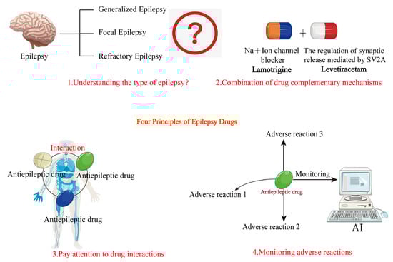 Basic principles of combination therapy for epilepsy. This figure outlines the fundamental principles of AED combination therapy. The basic principles are as follows: 1. Understand the type of epileptic seizures. 2. Choose antiepileptic drugs with complementary mechanisms. 3. Consider drug interactions when combining medications. 4. Monitor for adverse drug reactions during treatment.