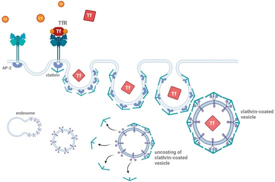 Schematic representation of clathrin-mediated endocytosis. Clathrin-mediated endocytosis begins with the binding of ligands (such as proteins or other molecules) to their receptors (e.g., transferrin, shown as TfR). The adaptor protein complex (AP-2) recruits clathrin to the site of receptor binding, forming a clathrin-coated pit. This pit then buds off from the plasma membrane, creating a vesicle encapsulating the receptor–ligand complex. The clathrin-coated vesicle undergoes uncoating, releasing the vesicle, which then fuses with early endosomes for further processing. This pathway is essential for cellular uptake and recycling of membrane proteins and ligands Thearrows indicate the uncoating process during clathrin-mediated endocytosis. The figure was created with BioRender.com (accessed on 11 March 2025).