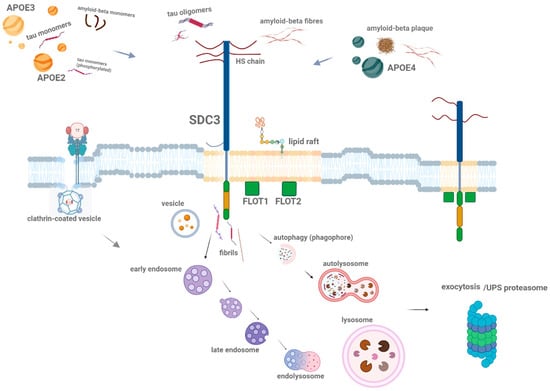 The interaction between ApoE and SDCs is closely tied to lipid raft-mediated endocytosis [14,146]. When ApoE interacts with Aβ, this complex is recruited to lipid rafts, where it is internalized into neurons through SDC-mediated endocytosis [14].