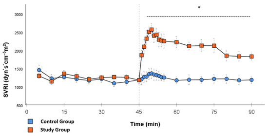 SVRI: Continuous monitoring of the systemic vascular resistance index during post-CPB observation. Values are expressed as mean ± SEM. * (p < 0.05) represents significant differences between the study and control groups at the respective time steps (Mann–Whitney U test). The dashed line displays the timeframe of significance. The reference line at 45 min signals the start of Glibenclamide application.
