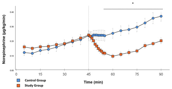 Norepinephrine: Continuous application of norepinephrine during post-CPB observation. Values are expressed as mean ± SEM. * (p < 0.05) represents significant differences between the study and control groups at the respective time steps (Mann–Whitney U test). The dashed line displays the timeframe of significance. The reference line at 45 min signals the start of Glibenclamide application.