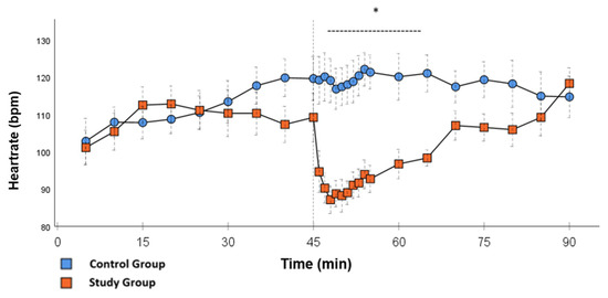 Heartrate: Continuous monitoring of the heart rate during post-CPB observation. Values are expressed as mean ± SEM. * (p < 0.05) represents significant differences between the study and control groups at the respective time stamps (Independent samples t-test). The dashed line displays the time frame of significance. The reference line at 45 min signals the start of Glibenclamide application.