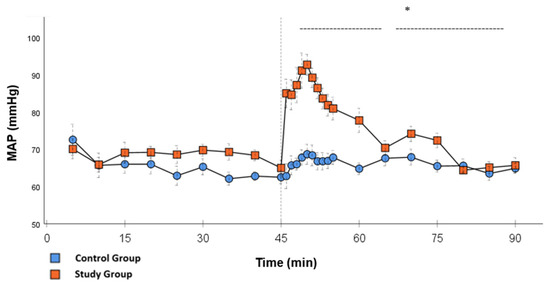 MAP: Continuous monitoring of the mean arterial pressure during post-CPB observation. Values are expressed as mean ± SEM. * (p < 0.05) represents significant differences between the study and control groups at the respective time steps (Mann–Whitney U Test). The dashed line displays the timeframe of significance. The reference line at 45 min signals the start of Glibenclamide application.