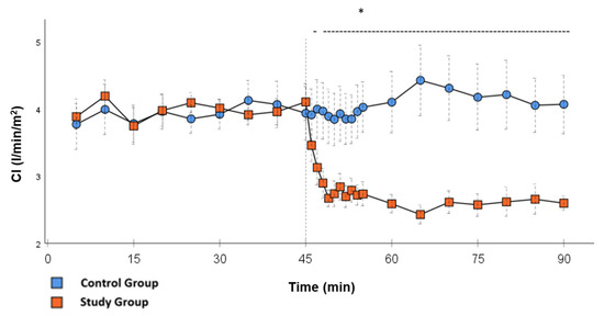 CI: Continuous monitoring of the pulse contour cardiac index during post-CPB observation. Values are expressed as mean ± SEM. * (p < 0.05) represents significant differences between the study and control groups at the respective time steps (Mann–Whitney U test). The dashed line displays the timeframe of significance. The reference line at 45 min signals the start of Glibenclamide application.