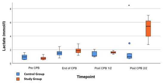 Lactate: Concentration of serum-lactate during whole experiment. Pre-CPB is before surgery, End of CPB is at the end of cardiopulmonary bypass, Post CPB 1/2 is just before the application of Glibenclamide in the study group, and Post CPB 2/2 represents the end of the experiment. Values are expressed as boxplots, continuing the median as a horizontal line inside the box. The first and third quantiles are the edges of the box. Whiskers have a distance of about 1.5 interquartile range to the edges. Outliers are plotted as dots. * (p < 0.05) represents significant differences between the Glibenclamide and control group at the respective time steps (Mann–Whitney U test).