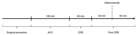 The study was divided into four time periods: Surgical procedure: time until the start of cardiopulmonary bypass and aortic cross-clamping; ACC: time on cardiopulmonary bypass while the aorta is cross-clamped (120 min); CPB: time on cardiopulmonary bypass during reperfusion (60 min); post-CPB: time after weaning from CPB, ongoing hemodynamic observations (90 min). Figure 7 shows the experimental protocol of the study. Hemodynamic parameters were documented every 15 min (ACC and CPB) and every 5 min in post-CPB, including HR, MAP, CI, SVRI, norepinephrine dose as well as blood gas parameters. Filling pressures and preload were kept within a standard range by administration of crystalloid solutions according to PiCCO® measurements.