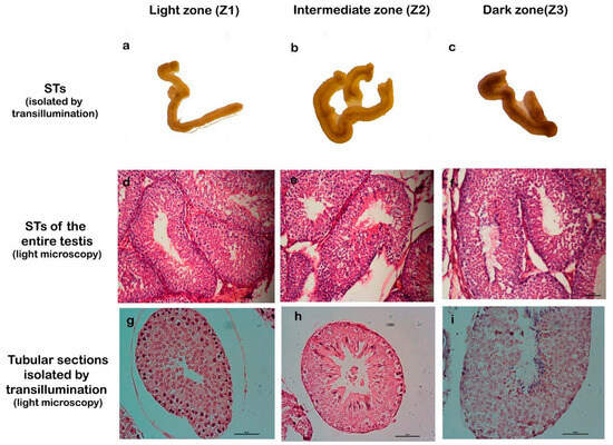 Figure 2. Correlation between transillumination zones and stages of the seminiferous epithelium. The first row (ac) shows seminiferous tubules (STs) isolated by transillumination and classified into zones Z1, Z2, and Z3. The second row (df) shows STs of the entire testis, stained with H/E, which correspond to the proposed stages. The third row (gi) corresponds to STs isolated by transillumination and processed for light microscopy, stained with H/E. Magnification: (df) 200×, (gi) 400×.