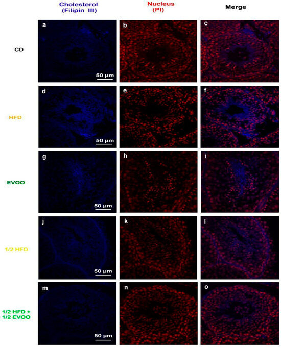 Figure 3. Cholesterol localization in the rabbit testis. Confocal microscopy images of testicular sections from adult rabbits stained with filipin (cholesterol, a,d,g,j,m), counterstained with propidium iodide (PI) to visualize nuclei (b,e,h,k,n), and merged (c,f,i,l,o) were presented in column, respectively. CD: rabbits on a normal diet (a,b,c); HFD: rabbits on a high-fat diet (d,e,f); EVOO: rabbits supplemented with extra virgin olive oil (g,h,i); ½ HFD: rabbits on a high-fat diet reduced by half (j,k,l); ½ HFD + ½ EVOO: rabbits fed a mixed diet (protective diet, m,n,o). Scale bar: 50 µm. Magnification: 600×.