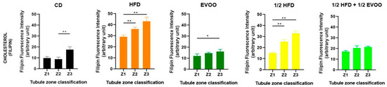 Figure 7. Quantification of cholesterol in different zones of the seminiferous tubule for each dietary group. Cholesterol distribution in zones Z1, Z2, and Z3 of the seminiferous tubule according to diet. Quantification of the mean fluorescence intensity (MFI) of filipin in different zones of the seminiferous tubule, represented as the mean ± SD (n = 4). CD: control diet; HFD: high-fat diet; EVOO: extra virgin olive oil; ½ HFD: half high-fat diet; ½ HFD + ½ EVOO, protective diet. Asterisks indicate significant differences between zones/stages of the spermatogenic cycle (* p < 0.05; ** p < 0.01). Multiple comparisons (Tukey test) corresponding to Filipin staining, according to the zone/stage of the seminiferous tubule epithelium, in each experimental group (Supplementary Material File S3—Table S4).