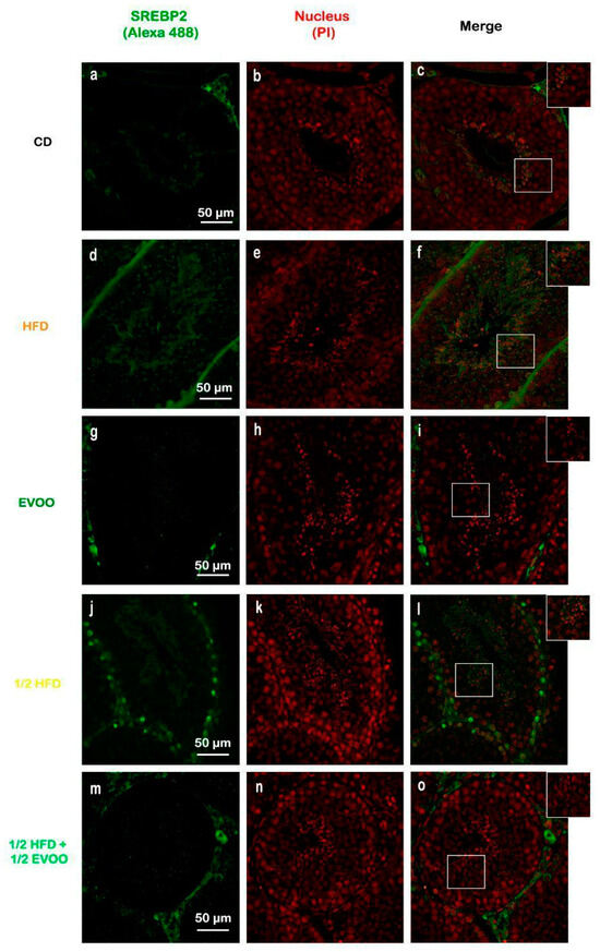 Figure 8. Immune location of SREBP2 in sections of seminiferous tubules corresponding to adult rabbit testes. Pictures was assemble using immune SREBP2 positive labels epithelial cells (Alexa 488, left column: a,d,g,j,m), propidium iodide (PI, cell nuclei, center column: b,e,h,k,n) and merge (right column, c,f,i,l,o) in columns and rows corresponding to diet (CD: rabbits on a normal diet, a,b,c; HFD: rabbits on a high-fat diet, d,e,f; EVOO: rabbits supplemented with extra virgin olive oil, g,h,i; ½ HFD: rabbits on a high-fat diet reduced by half, j,k,l; ½ HFD + ½ EVOO: rabbits fed a mixed diet—protective diet, m,n,o). White squares indicate the regions of interest used for densitometry analysis. Scale bar: 50 µm. Magnification: 600×.