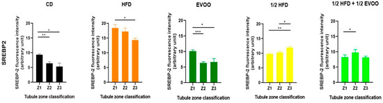 Quantitative analysis revealed that the CD group exhibited a relatively consistent fluorescence signal across all zones (Figure 11). The HFD and ½ HFD groups showed a generalized increase in SREBP2 compared to CD, but with a gradual decrease in signal intensity from Z1 to Z3 (Figure 11). Conversely, the addition of olive oil to the ½ HFD significantly reduced the SREBP2 signal (row 5, Figure 10), with no significant differences observed across zones (Figure 11).