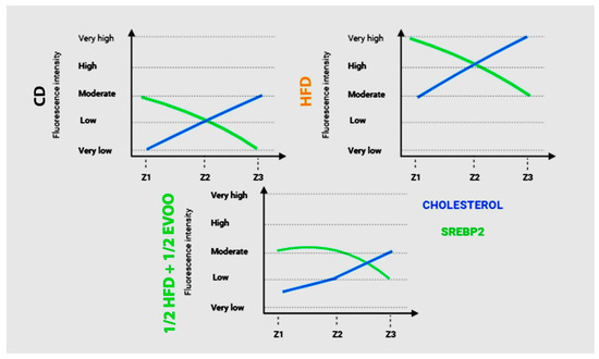 A comparison of fluorescence intensity between cholesterol and SREBP2 showed an increased signal from Z1 to Z3 or a linear downward slope, respectively, in any diets probed here. However, the threshold is higher for FHD than CD or ½ HFD + ½ EVOO (protective diet).