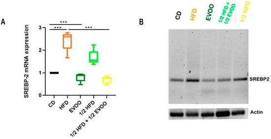 Figure 14. Expression of SREBP2 mRNA in rabbit testis under different diets. (A) Quantitative analysis of the relative expression of SREBP2 mRNA in testicular tissue from rabbits fed with different diets, corresponding to expression of SREBP2 mRNA—(B). Values represent the mean ± SD of three independent experiments, normalized to β-actin expression. CD: rabbits on a normal diet; HFD: rabbits on a high-fat diet; EVOO: rabbits supplemented with extra virgin olive oil; ½ HFD: rabbits on a high-fat diet reduced by half; ½ HFD + ½ EVOO: rabbits fed a mixed diet (protective diet). Asterisks indicate significant differences p < 0.001.