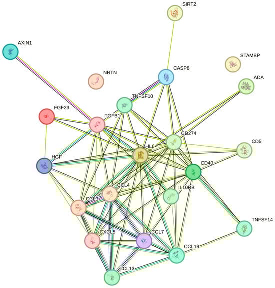 The platelet counts were significantly associated with FGF-23, IL-10RB, LAP TGF-beta-1, CCL19, SIRT2, IL6, VEGFA, AXIN1, CASP-8, CD40, PD-L1, CXCL5, MCP-3, STAMBP, CCL3, NRTN, HGF, CD5, TRAIL, CCL4, ADA. TNFSF14, and MCP-4 in increasing the Benjamini–Hochberg p-values order (Table 2). In the String plot for the cytokines that were significantly related to platelet counts, IL6 had a central role (Figure 1). The strongest associations with the platelet count were observed for MCP-3 and STAMBP (p = 0.052, both) and for CCL3 (p = 0.054), respectively.