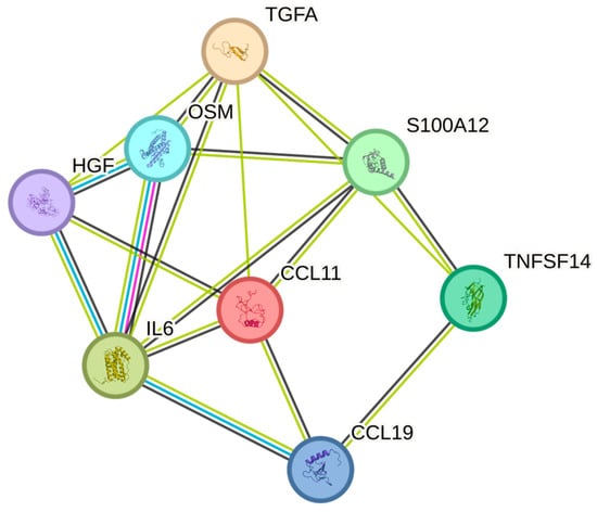 The white blood cell counts were significantly associated with OSM, IL6, HGF, TNFSF14, EN-RAGE, TGF-alpha, CCL19, and CCL11in order of increasing p-values (Table 2). The greatest number of associations in the String plot was between OSM and IL6 (Figure 2). The strongest associations with the WBC were observed for OSM (p = 1.28 × 10−7), IL-6 (p = 0.002), and HGF (p = 0.017), respectively.