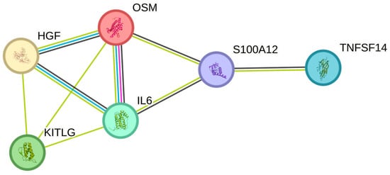 The neutrophil count showed similar associations as white blood cell counts and were significantly associated with OSM, IL6, TNFSF14, HGF, EN-RAGE, and SCF (Table 2). Similar to white blood cells, the most associations in the String plot were observed between OSM and IL6 (Figure 3). The strongest associations with the neutrophil cell count were observed for OSM (p = 4.73 × 10−9), IL-6 (p = 0.002), and TNFSF14 (p = 0.040), respectively.