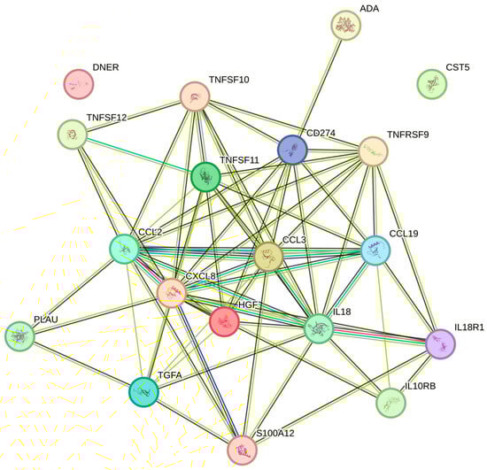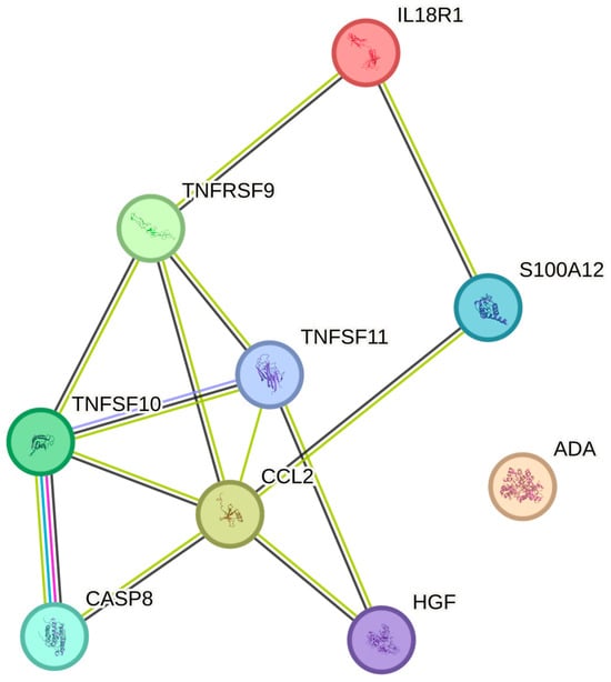 The red blood cell counts were significantly associated with TRAIL, IL-18R1, HGF, MCP-1, TRANCE, TNFRSF9, ADA, EN-RAGE, and CASP-8 (Table 2). The greatest number of associations in the String plot was noted between TNFSF10 and Casp-8 (Figure 4). The strongest associations with the red blood cell count were observed for TRAIL, IL-18R1, and HGF, respectively (p = 0.017, all).