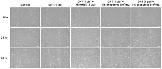 HFDPCs were incubated in a 5% CO2 environment for 24 h. The center of the well was scratched using a 1 mL pipette tip. After aspirating the culture medium, the cells were treated with 1 µM DHT (Sigma-Aldrich, St. Louis, MO, USA), Iris-exosomes (107 and 108 particles/mL), and 1 µM MIX (Sigma-Aldrich, St. Louis, MO, USA) followed by incubation for 24 h. To achieve final concentrations of 107 and 108 particles/mL, 2 µL or 20 µL of a 1010 particles/mL stock solution were added to 2 mL of medium, respectively. Images were captured at 0, 24, and 48 h post-treatment using a Nikon light microscope (Tokyo, Japan) to assess wound closure.