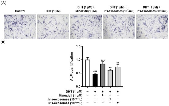 Effects of Iris-exosomes on alkaline phosphatase expression levels in HFDPCs stimulated by 1 µM DHT. Cells were treated with Iris-exosomes (107 and 108 particles/mL) or 1 µM MIX for 24 h. (A) Representative alkaline phosphatase staining images, showing results from one of three independent experiments (scale bar 20 µm). (B) The expression levels of alkaline phosphatase were quantified using ImageJ software, version 1.53e. Results are presented as mean ± SD (n = 3), with statistical significance denoted as ** p < 0.01 and *** p < 0.001 relative to the DHT-treated group. ### p < 0.001 compared with the control group.