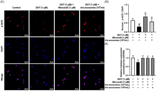 Nrf2 plays a crucial role in the cellular defense against oxidative stress by regulating the transcription of various antioxidant enzymes, including catalase [59,60]. Translocation of phosphorylated Nrf2 (p-Nrf2) to the nucleus was evaluated by immunofluorescence staining. We demonstrated that Iris-exosomes enhanced the activity of Nrf2 and the expression of catalase, which were downregulated in response to DHT treatment (Figure 5C–E).