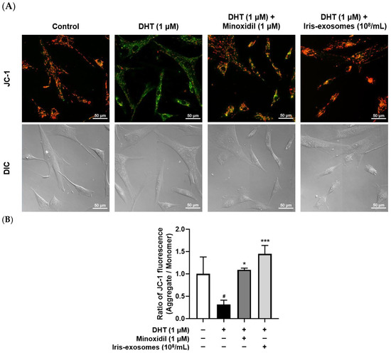 Effects of Iris-exosomes on mitochondrial membrane potential in HFDPCs stimulated by 1 µM DHT. The JC-1 assay was conducted on HFDPCs treated with 1 µM DHT, followed by treatment with Iris-exosomes (108 particles/mL) or 1 µM MIX for 24 h. (A) Representative JC-1 fluorescence images. Green fluorescence represents depolarized mitochondria, while red fluorescence indicates hyperpolarized mitochondria. Images represent data from three independent experiments (scale bar 50 µm). (B) Mitochondrial membrane potential was quantified using ImageJ software, version 1.53e. Data are presented as mean ± SD (n = 3), with statistical significance denoted as * p < 0.05 and *** p < 0.001 relative to the DHT-treated group. # p < 0.05 compared with the control group.
